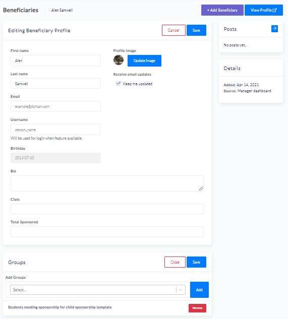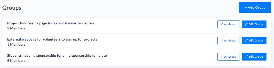 Groups and pages are set up in the settings, and beneficiaries can be added to a group directly from within the community management system, within their individual beneficiary profile.