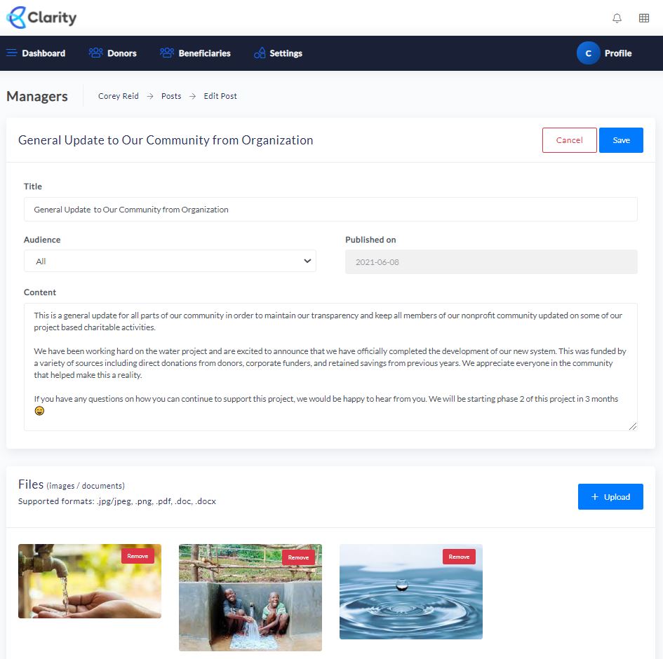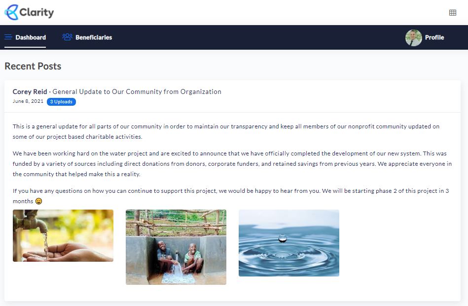 For completion, it is also important to consider what the donors and beneficiaries of your community will see when you make an update to the community. The following is an image of the member’s perspective, related to the general update we previously created.