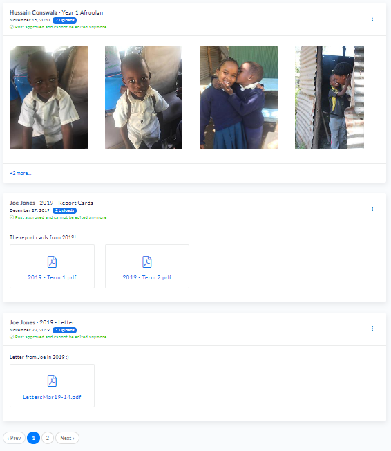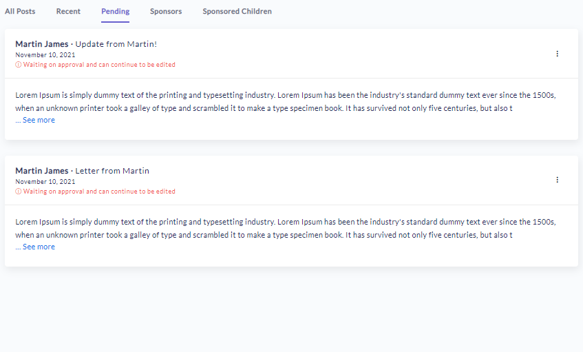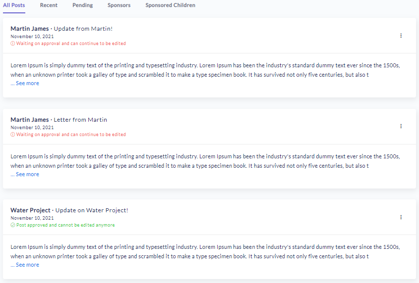 As shown above, we now have five filters for better navigation through the dashboard. “All Posts” is used to show all the posts in the platform that can be navigated through using the navigation bar at the bottom of the list of posts available on the first page. “Recent” is used to show all the posts that have occurred within the last 24 hours. “Pending” is for the list of posts that are not yet approved and need organizational allowance prior to being visible on their audiences view. “Sponsors” and “Sponsored Children”, or whatever the naming convention your system is set to use for donors and beneficiaries (this can be changed in the settings) shows all the posts in the platform from each of these two types of nonprofit members. Together, they provide a much more user friendly experience for the administrators moderating the platform.
